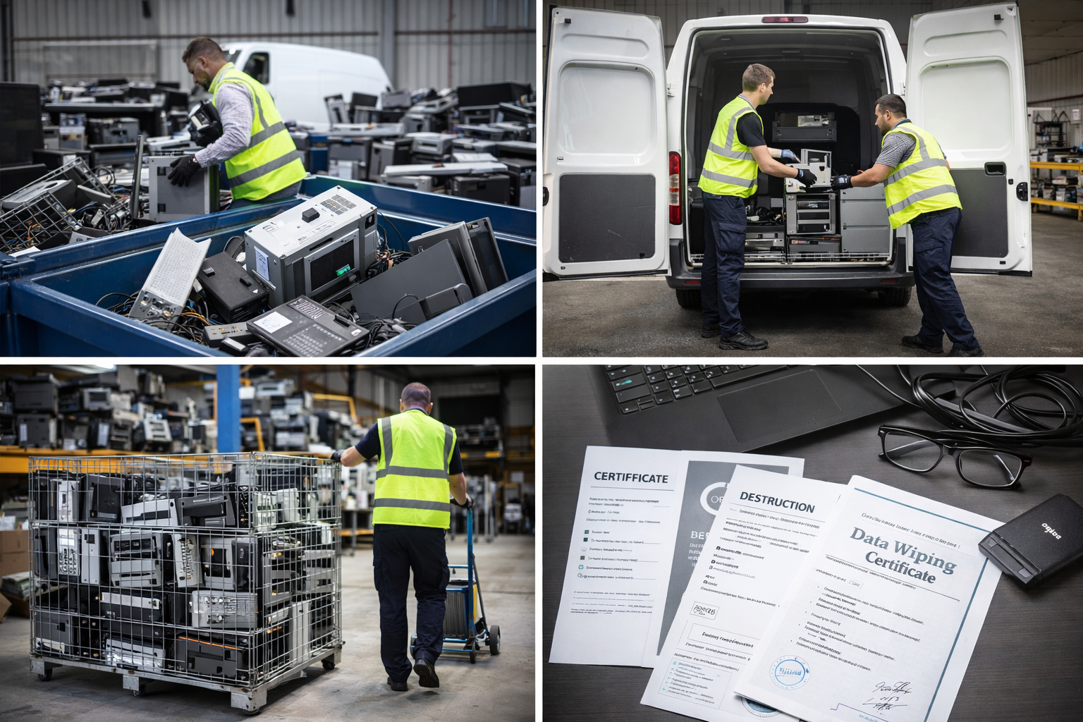 Interventions rapides (48–72 h selon volumes et accès), certificats RSE et effacements des données certifiés RGPD. Collecte, tri, pesée, traçabilité Trackdéchets.